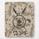 Uma representação marrom militar "subjugada" do escudo de um Maccabee e duas lanças sobre o fundo do camo do deserto. O escudo é enfeitado por um leão e o texto lendo "Yisrael" (Israel) no alfabeto paleohebraico. O texto hebraico que lê "Maccabee" também aparece. Os Macabeus eram rebeldes judeus que libertaram Judeia do jugo do Império Seleúcio. Chanukkah não é apenas um festival de inverno-médio com velas e iguarias fritas, ela celebra uma vitória militar, e garante a liberdade religiosa, sobre o Império Seleúcio. Além disso, a revolta foi uma guerra civil envolvendo aqueles judeus que eram leais ao G-d e aqueles que tinham adotado o Hellenismo dos Seleucids.