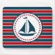 Design náutica com decoração de embarcações à vela em forma redonda com estrelas sobre fundo listrado vermelho, azul e branco