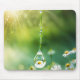 Grande gota de água age como lente, reprimindo lindamente uma imagem de margarida com uma corda de outra gota sobre um caule verde