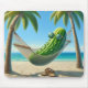 Um grande picles verde numa rede entre duas palmeiras tropicais numa praia com flip-flops.