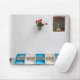 Mousepad com um altar do santuário ou da rua com uma estátua pequena da Virgem Maria, de flores e de um banco azul e branco na cidade branca Ostuni em Puglia, Italia.