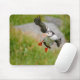 Mousepad com um papagaio-do-mar atlântico que birdflying com as asas espalhadas antes de aterrar na ilha de Runde na costa atlântica de Noruega.