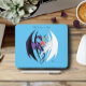 Um dragão roxo e um dragão branco no ar com um coração rosa celta e vermelho entre eles em um pano de fundo azul