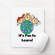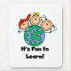 A figura miúdos de três varas cerca um globo do mundo e o texto lê-o "é divertimento a aprender!" em t-shirt temáticos da escola, em cartões, em canecas, em etiquetas, em botões, e na outra engrenagem!