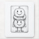 A pencil sketch of an electrical outlet featuring smiling faces and a hug, set against a white background