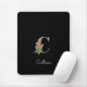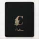 O mouse preto elegante apresenta um monograma botânico dourado no centro.
