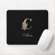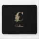 O mouse preto elegante apresenta um monograma botânico dourado no centro.