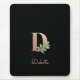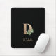 O mouse preto elegante apresenta um monograma botânico dourado no centro.