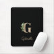 O mouse preto elegante apresenta um monograma botânico dourado no centro.