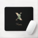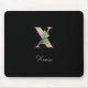 O mouse preto elegante apresenta um monograma botânico dourado no centro.