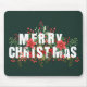 A Tipografia Branca Elegante Feliz Natal Deep Evergreen, Esta linda foto de presentes de Natal apresenta elementos florais desenhados manualmente em vários tons de coral, vermelho-branco, menta, lacre, limão e verde. Incluem-se os pinheiros, flores, prigos, folhas, bagas e botões, juntamente com a tipografia moderna em Branco, lendo "Feliz Natal". A cor de fundo é um verde profundo e a parte traseira da placa contém faixas multicoloridas correspondentes