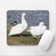 Embden Geese a prender-se e a descansar ao lado de um lago. Keighley, West Yorkshire, Reino Unido.