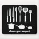 Escolha sua arma! Aventais do cozinhar, camisas, camisas das camisetas e presentes engraçados e divertidos para o cozinheiro, o cozinheiro chefe e o perito do assado. Utensílios de cozinhar cómicos com potes, facas, espátula e mais. Os aventais bonitos e legal e os presentes do cozinheiro para o Natal, os aniversários ou a alguma ocasião.