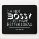 Este porta-voz é perfeito para todas as mulheres ambiciosas lá fora. Se você é o tipo de pessoa que está sempre explodindo com ideias excelentes, então você precisa deste mouse na sua mesa. Ele diz ousadamente, "Eu não sou mandona, eu só tenho ideias melhores", dando o tom para o seu dia de trabalho. Também é um presente perfeito para o seu amigo ou colega que tem a mesma atitude de assumir a responsabilidade. É certo trazer um sorriso à sua face e um senso de humor para o seu espaço de trabalho. Quer você trabalhe em um escritório ou em casa, este estranho musepad é uma excelente maneira de mostrar sua confiança e avisar a todos quem está no comando.