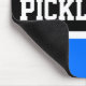Este design de diversão apresenta grandes letras esportivas dentro a uma faixa preta larga, destacada com listras brancas em um fundo brilhante de cor laranja e azul-céu. As cores e o texto PICKLEBALL neste design de modelo podem ser personalizados.