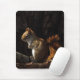 Este painel de discussão apresenta um momento fora do tempo. Um belo esquilo vermelho está sentado num galho num manto de luz solar em frente ao latido texturizado escuro de uma cerejeira selvagem.