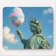 A Estátua da Liberdade é ilustrada de forma humorística segurando um algodão doce gigante contra um pano de fundo de um céu claro e nuvens fofas, adicionando um charme caprichoso à cena