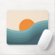 Ilustração retrorativa colorida do estilo sazonal com ondas do mar azuis e decoração solar no pôr do sol para todos que gostam da natureza e esperam pelas aventuras de verão.