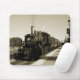 Uma fotografia sépia de uma locomotiva a vapor histórica enquanto ela sai do passado; um belo presente para qualquer aficionado do trem.