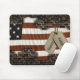 Dog tags militares na bandeira atrás do muro de tijolos.