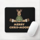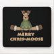 Um alce em botas de caminhada e um suéter verde e texto que diz "Feliz Chris-Moose" aparece nesses cartões de cartões de natal, botões, ímãs, sacos de tote, T-shirts e muito mais.