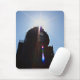 Uma histórica locomotiva a vapor ergue-se sob o sol do meio-dia em Kingman, Arizona, sua silhueta enquadrada por um céu brilhante e reflexo de lente natural. A perspectiva enfatiza escala e força, capturando um momento em que a história industrial encontra a dura luz do deserto.