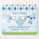 Um bebê novo e fofo fica exibindo uma linha de roupas com roupas de bebê azuis e bebê, manchado com um pássaro azul sentado na linha. O nome da criança é o centro de topo em grandes letras decorativas azuis, e no fundo também em letras azuis estão as estatísticas vitais - data e hora de nascimento, peso e comprimento. Um nome perfeito para aquele novo bebê. Tudo isso em um fundo azul, branco e rosa (diamante) argyle.
