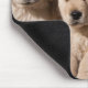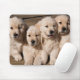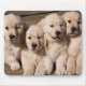 Uma fotografia de quatro filhotes de cachorro bonitos do golden retriever que sentam o mordente-à-mordente que olha brincalhão e feliz.