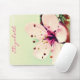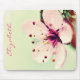 Vista de perto da delicada flor de cereja. Uma flor pastel rosa com pétalas redondas macios. O fundo é um verde limão pálido. Personalize com um nome em uma fonte cor-de-rosa pastel.