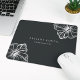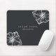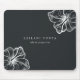 O chic personalizado mousepad da ilha para sua empresa ou escritório doméstico apresenta duas linhas de texto personalizado em letras brancas clássicas, em um fundo preto macio adornado com duas ilustrações de flor de hibisco tropical em folha de prata falsa para um olhar de vidro de praia.