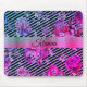 Sombras de flores rosa-quentes e roxas em um pano de fundo rosa-quente, verde e listrado preto para um brilho extra e uma fita rosa-reluzente onde você pode personalizá-lo. vibrações na moda.