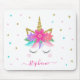 Este mouse pad de unicórnio apresenta um design de rosto de unicórnio com flores, estrelas e brilho dourado sujo. Personalize-o com um nome.