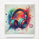 Fones de ouvido coloridos reproduzidos em estilo artístico vívido e com um fundo abstrato de platter evocando música e criatividade.