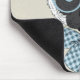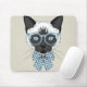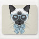 Características que deste design um gato Siamese se vestiu em um par de vidros azul e de laço checkered.