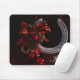 Um mouse pad com uma foto com uma ferradura enforcada adornada com uma fita de xadrez de búfalo e decorações de Natal.