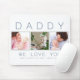 Adicione suas fotos e mensagem de Dia de os pais a este bonito tapete de mouse personalizado com foto do "Pai We Love You". Um espaço para 3 imagens e espaço personalizado com seus nomes na parte inferior. O texto é definido em uma fonte moderna em azul e cinza. Adequado para Dia de os pais, aniversários ou Natal.