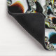 Este mouse pad apresenta uma arte fractal espiral abstrato, psicodélica em preto e branco com sotaques amarelos, laranja, azuis e verdes.