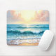 Ondas vagam suavemente em uma praia arenosa sob um céu vibrante cheio de nuvens rosas e fofinhas