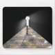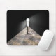 Pintura surreal. Figura do homem caminhando na estrada de pedra até o buraco no espaço