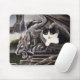 Um gatinho Tuxedo preto e branco está sentado com um gárgula. Atrás deles está um castelo gótico.