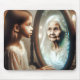 Uma jovem olhando para uma doce senhora vestindo um véu no espelho