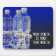 Garrafas de água sobre fundo de gradiente azul com arco de medida de fita. O texto pode ser editado.