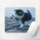 Esta é uma gatinha bonita brincando com uma flor crescendo através de um tapete/almofada de rato de crack