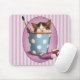 Gatinho adorável que napping em um pote azul do lápis das bolinhas, pintado pelo artista Maryline Cazenave.