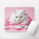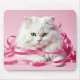 Bonito gato branco com olhos verdes enredados em fitas de cetim rosa sobre fundo rosa