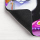 Mouse Pad em ilustração de um tuxedo preto e branco sobre uma almofada, com um fundo exótico, padronizado em tons de magenta e roxo