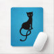O mousepad elegante com uma ilustração bonita de um gato preto mau gracioso com incandescência eyes em um fundo azul vibrante textured grunge.