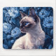 Um gato siamês com olhos azuis flagrantes se senta em meio a um jardim de flores azuis. O pelo branco do gato contrasta lindamente com as cores azuis profundas das flores, criando uma cena visualmente cativante. O olhar do gato é direcionado para a direita, acrescentando um senso de mistério e intrigação à imagem. O fundo é um borrão azul e verde, sugerindo uma atmosfera serena e pacífica.