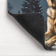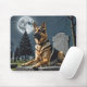 Um cão German shepherd senta-se vigilantemente sobre um pedreiro num cemitério à noite sob o brilho de uma lua de cheio