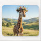 Uma girafa encantadora vestindo uma coroa de flores coloridas está em um campo iluminado pelo sol, com colinas serenas ao fundo